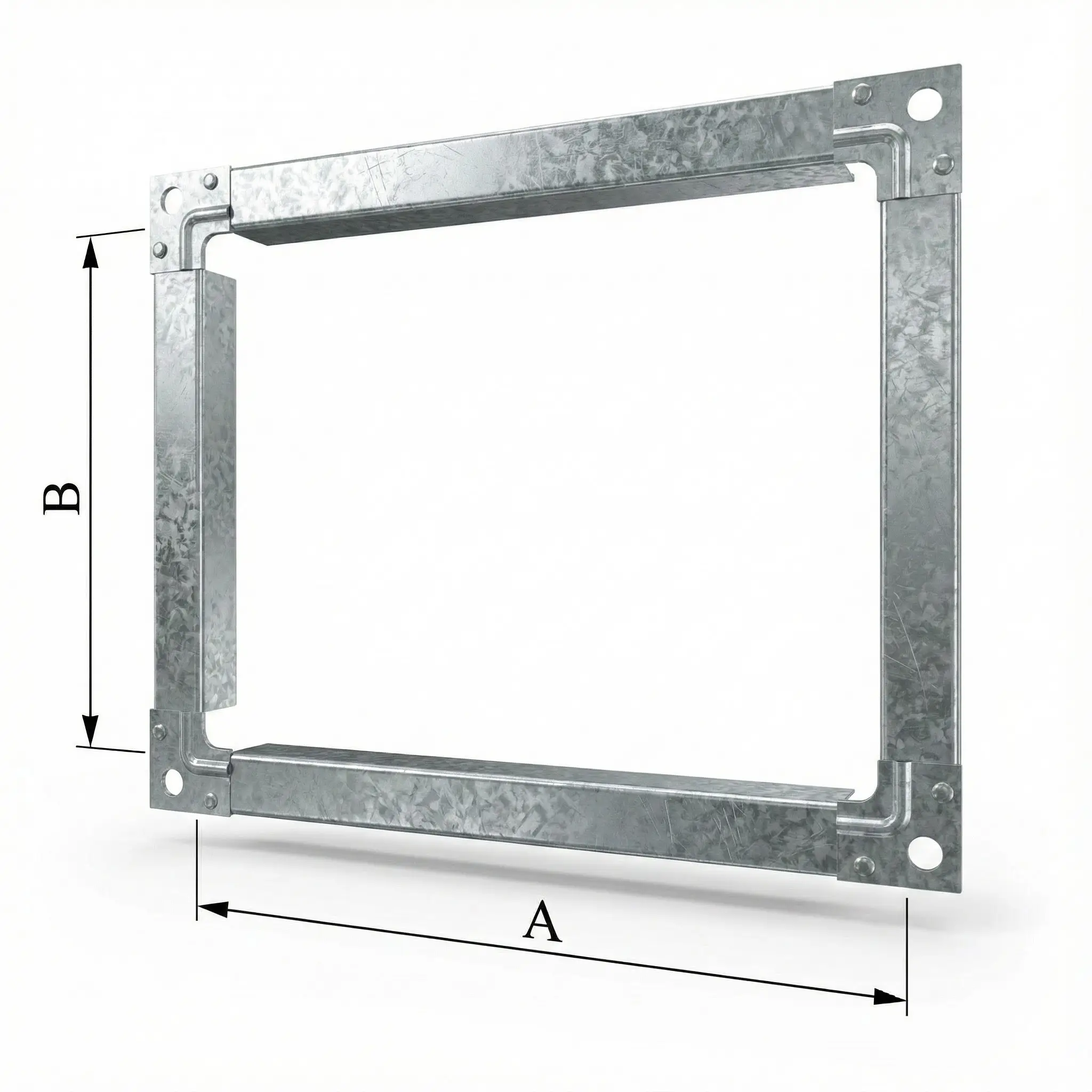 Вентиляционный фланец из шины No20 представляет собой готовую сборочную единицу — прямоугольную рамку, изготовленную строго по размерам сечения воздуховода (A×B). Изделие конструктивно состоит из четырёх отрезков монтажной шины профиля No20 и четырёх оцинкованных уголков (УГФ-0), жёстко зафиксированных в углах методом пуклёвки. Такие фланцы используются в качестве ответных элементов при подключении вентиляционного оборудования, клапанов, гибких вставок, а также для формирования фланцевого соединения на прямых участках, подвергшихся подрезке непосредственно на объекте монтажа.